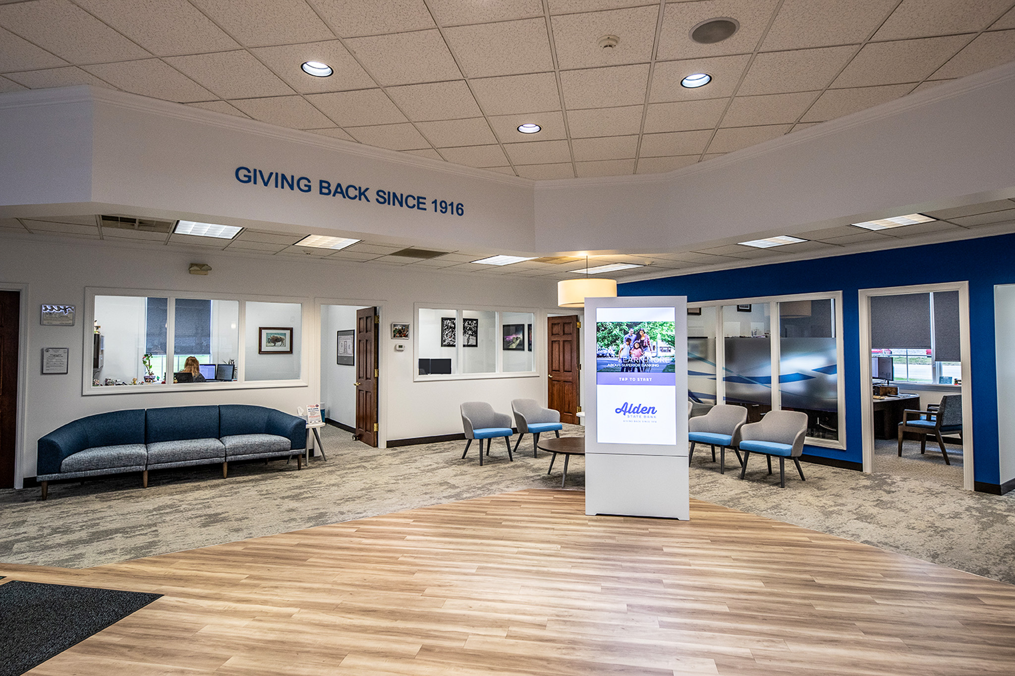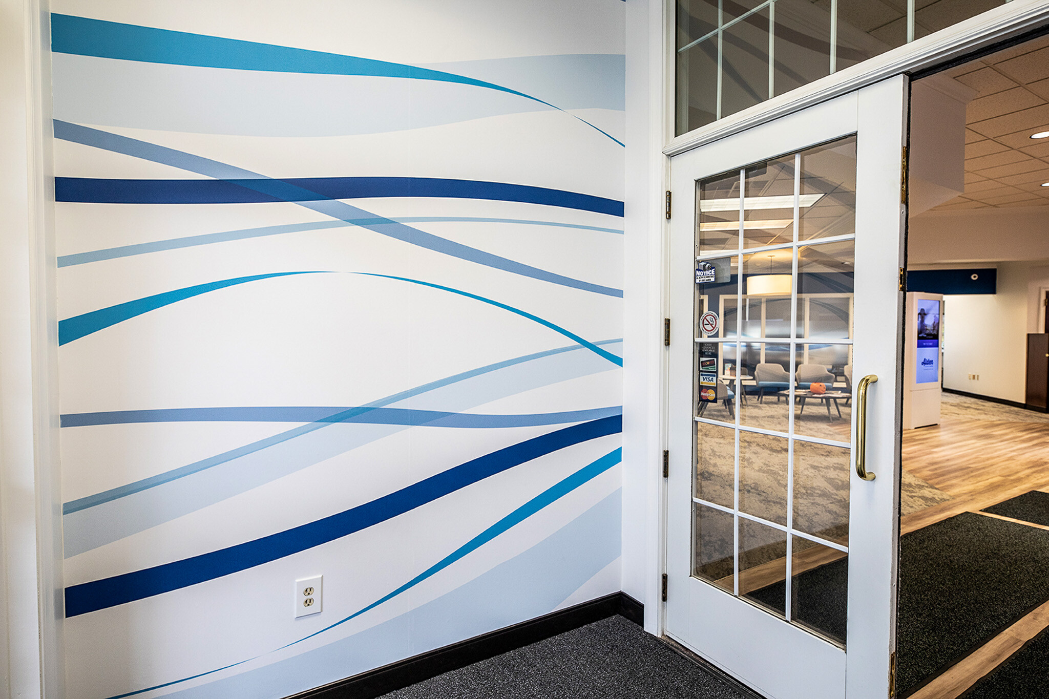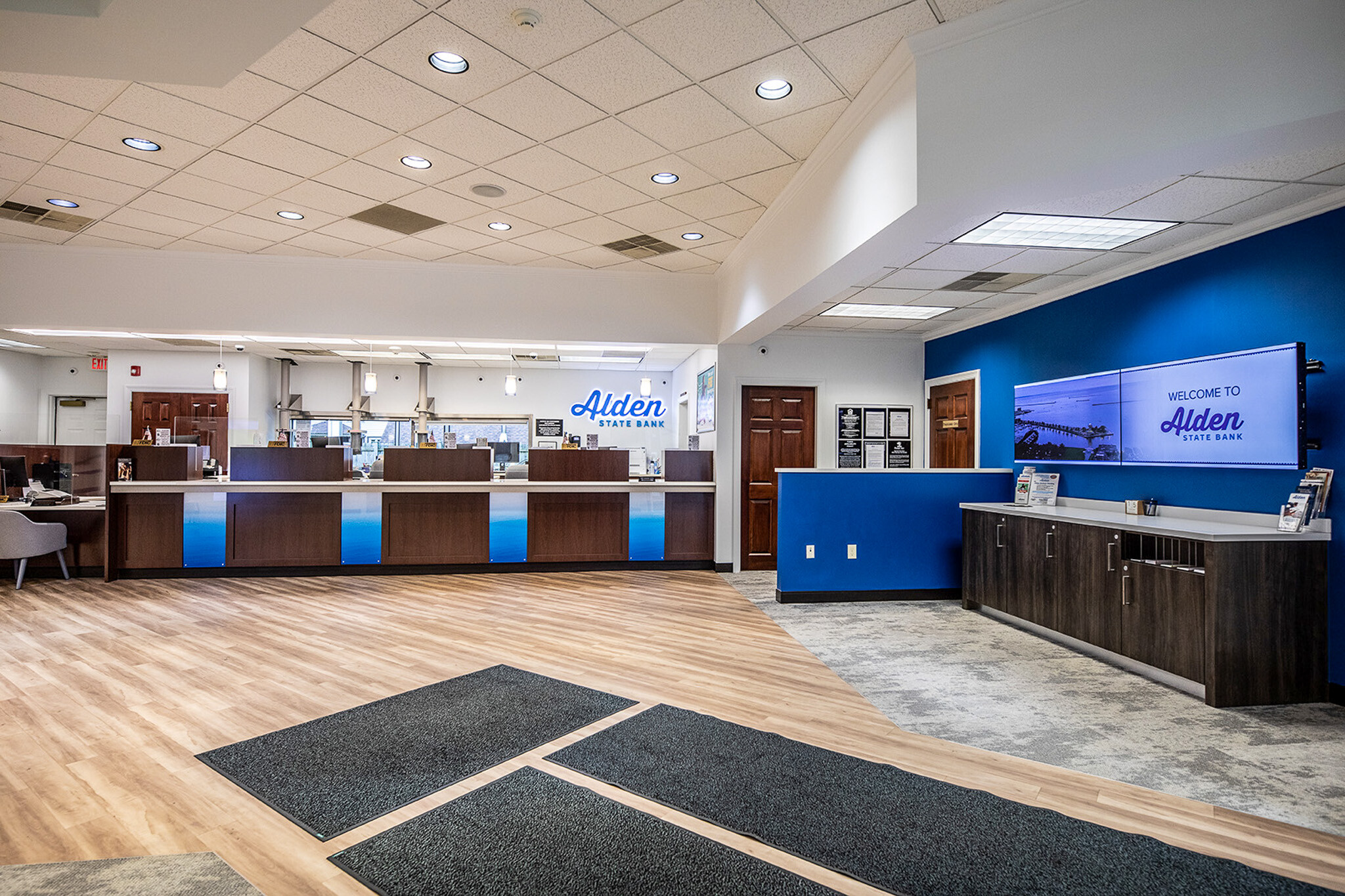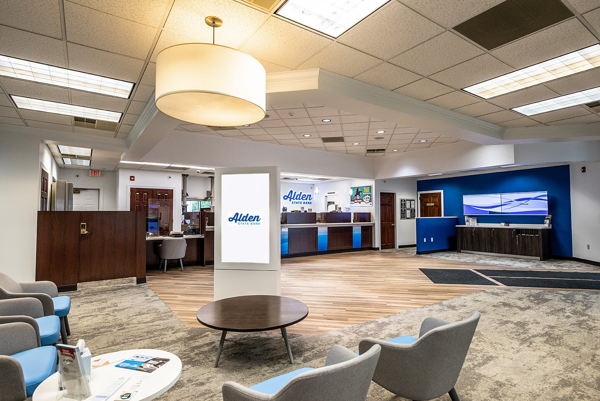 Alden State Bank was focused on improving the customer experience of this retail branch space. Wall decals, office window decals, signage and casework, and digital displays can be found carefully dispersed throughout the branch. The brand colors on accent walls help elevate the branch atmosphere and allow for the visiting customers to develop a connection with their choice bank.