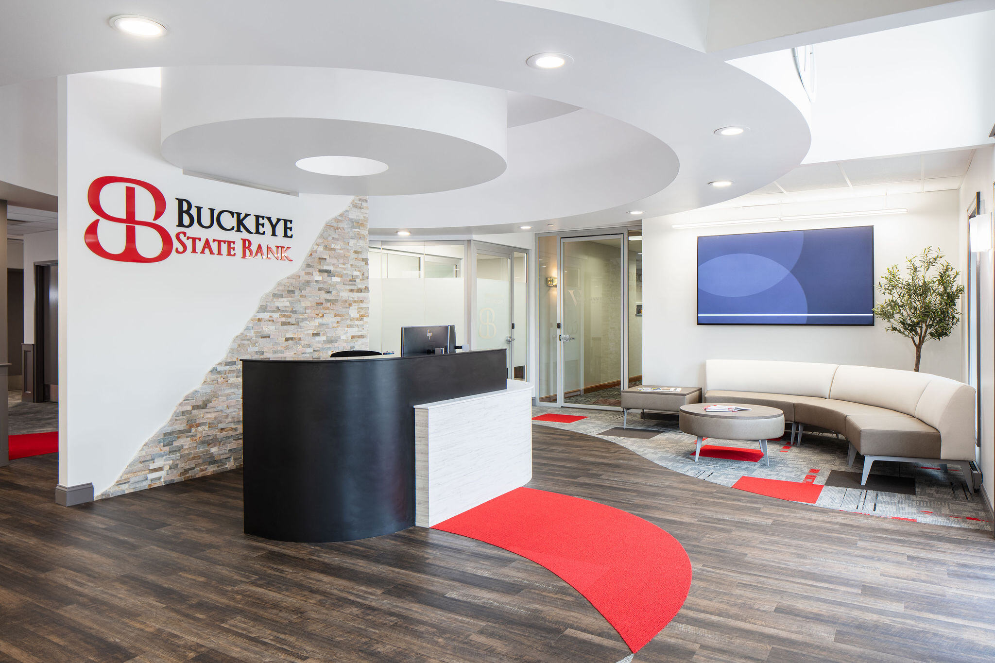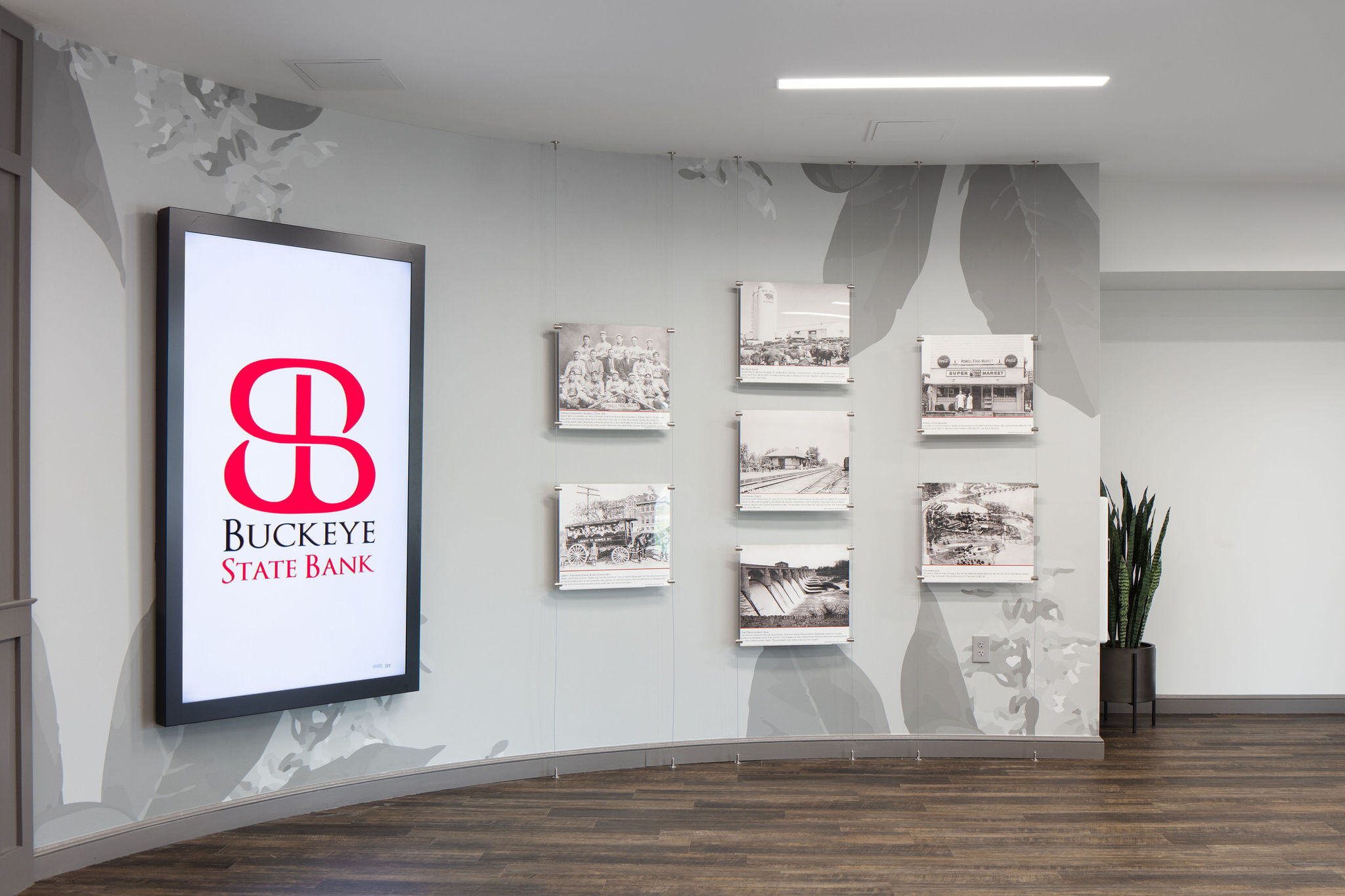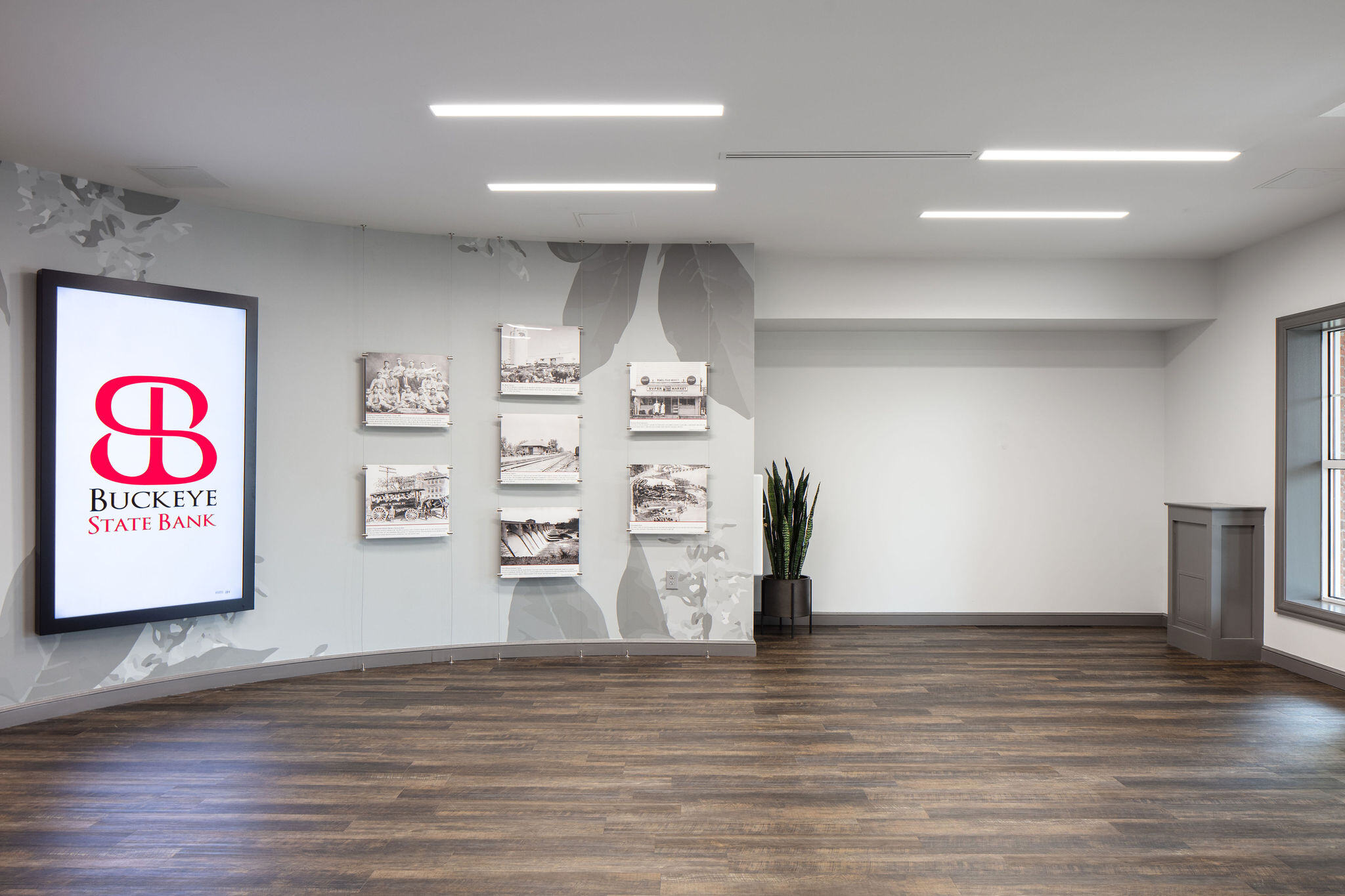 Upon entering the administrative space, visitors are met with a branded and welcoming atmosphere. Buckeye State Bank's colors are thoughtfully placed throughout the area, drawing the eye from digital displays to history walls.