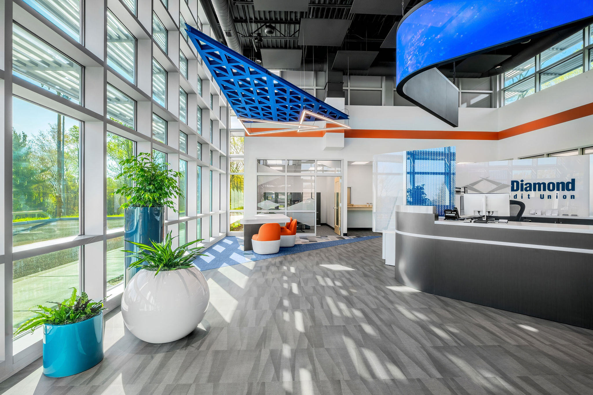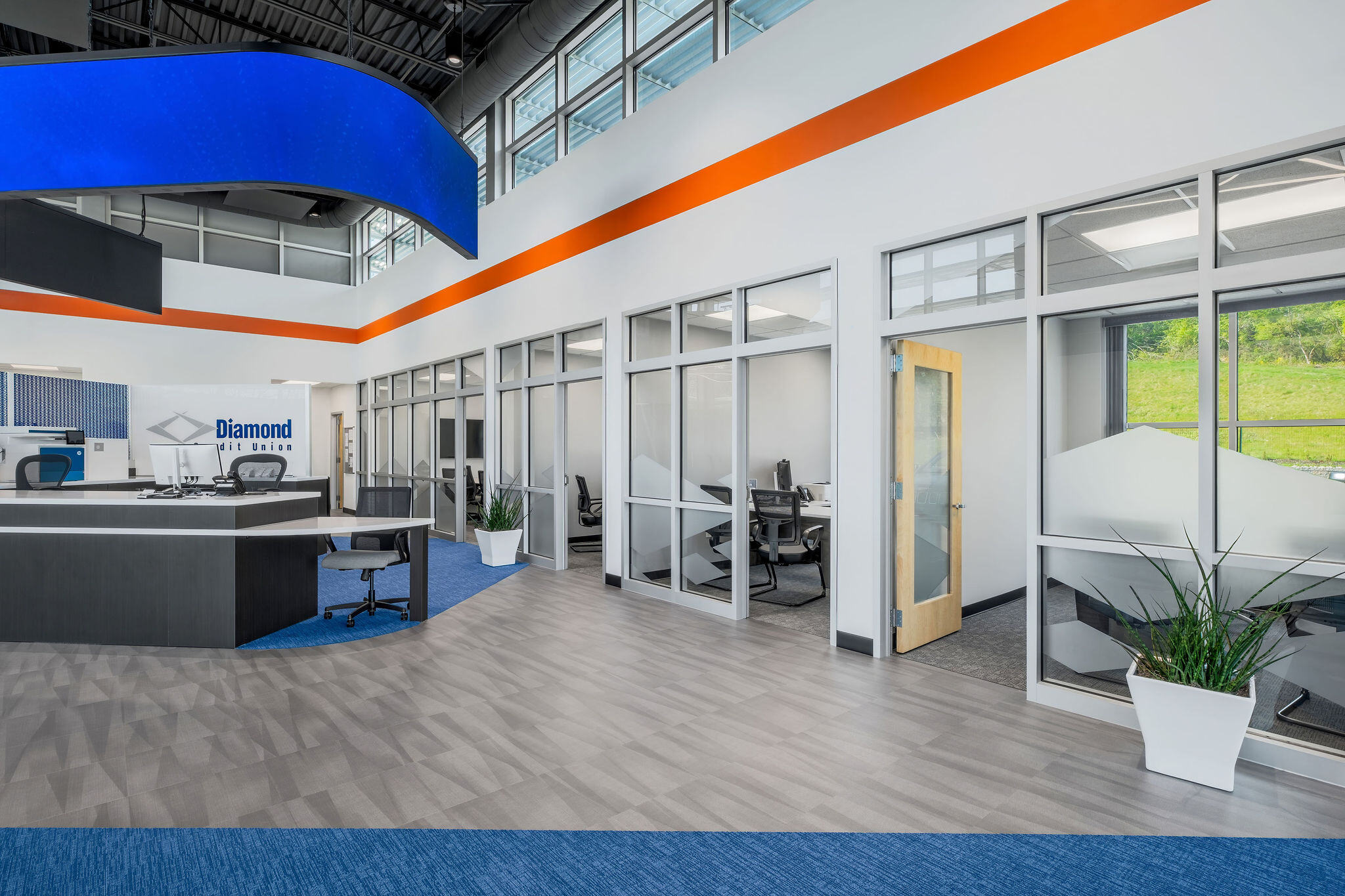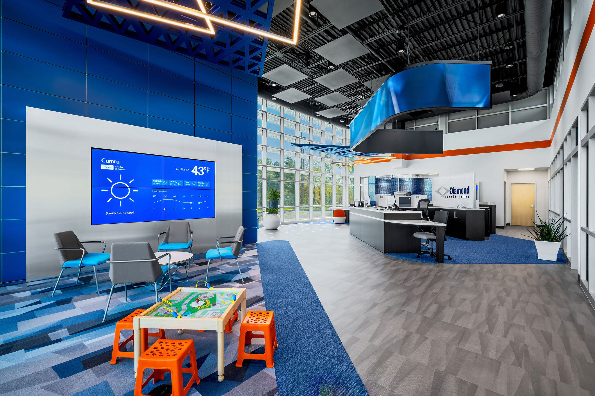 Throughout the whole branch, you will see Diamond Credit Union's brand displayed. From the casework to the ceiling features, members are given a strong sense of identity to adhere to, a place they belong. Their vibrant blues and oranges are strategically placed to allow visitors to see the whole branch naturally in a dynamic and exciting way.