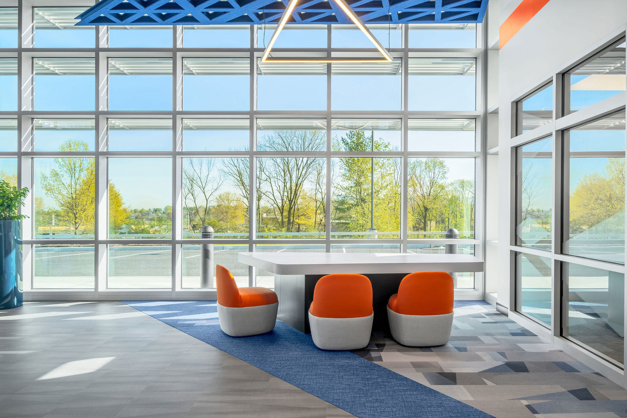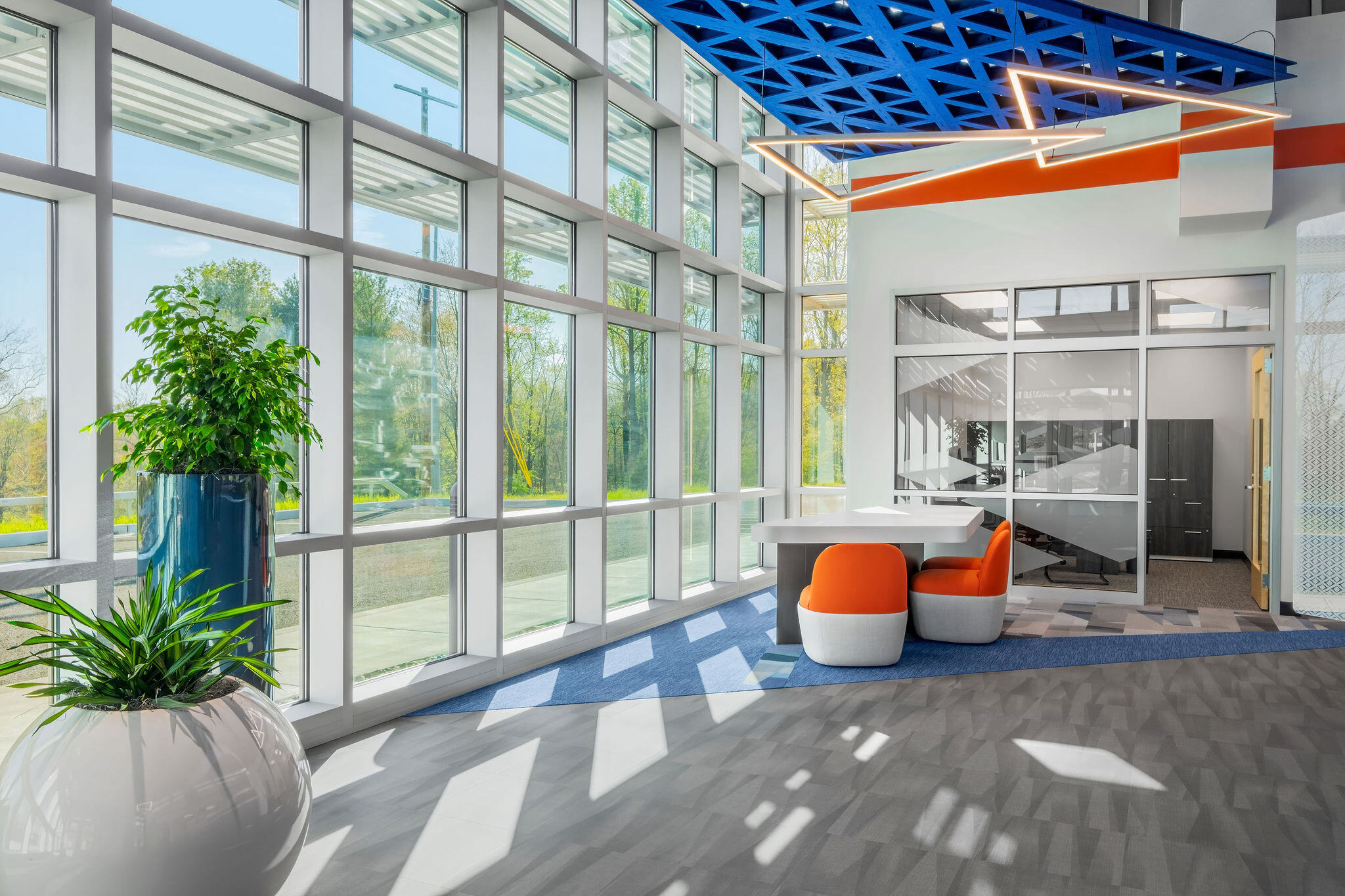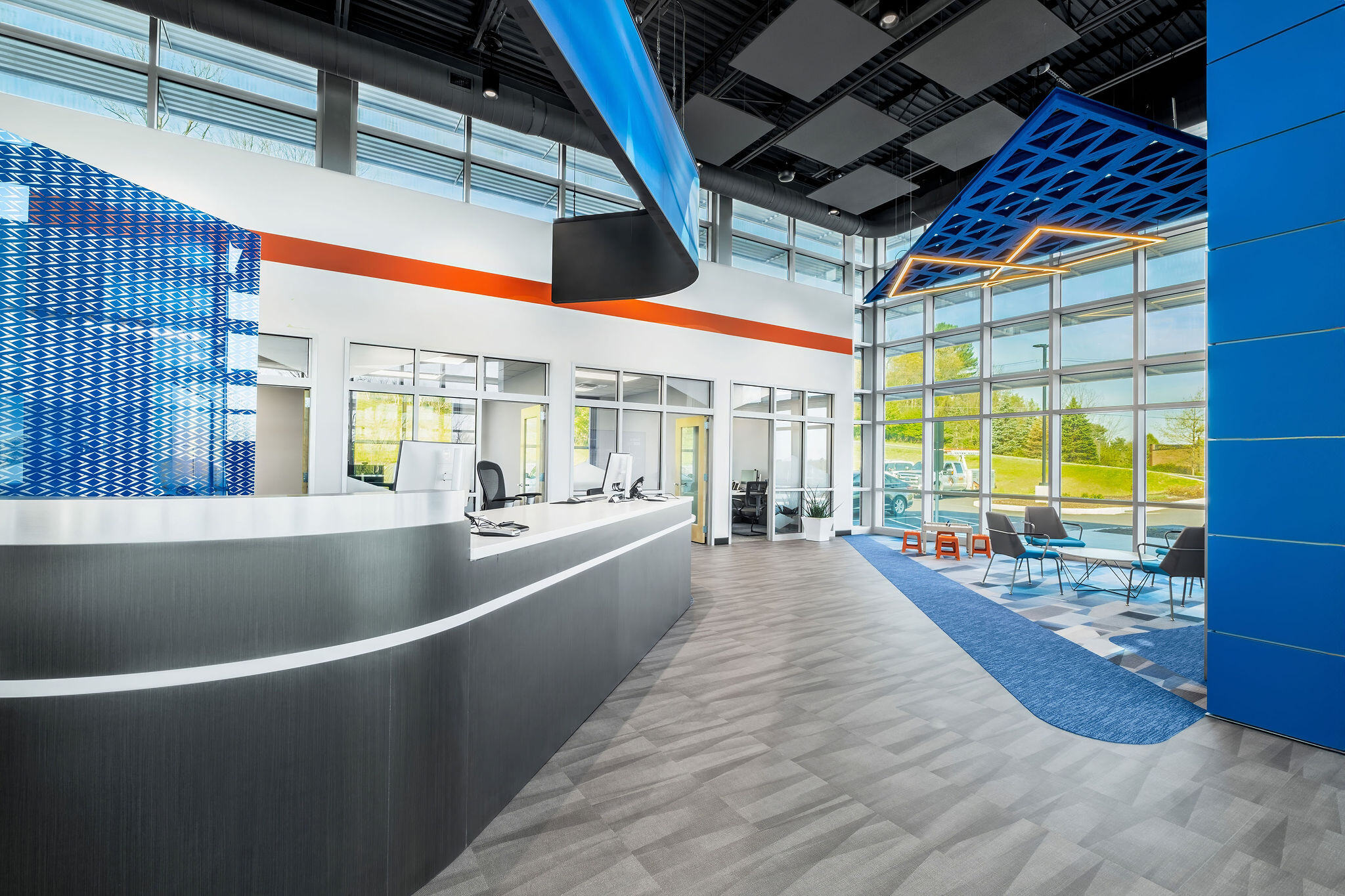 Throughout the whole branch, you will see Diamond Credit Union's brand displayed. From the casework to the ceiling features, members are given a strong sense of identity to adhere to, a place they belong. Their vibrant blues and oranges are strategically placed to allow visitors to see the whole branch naturally in a dynamic and exciting way.
