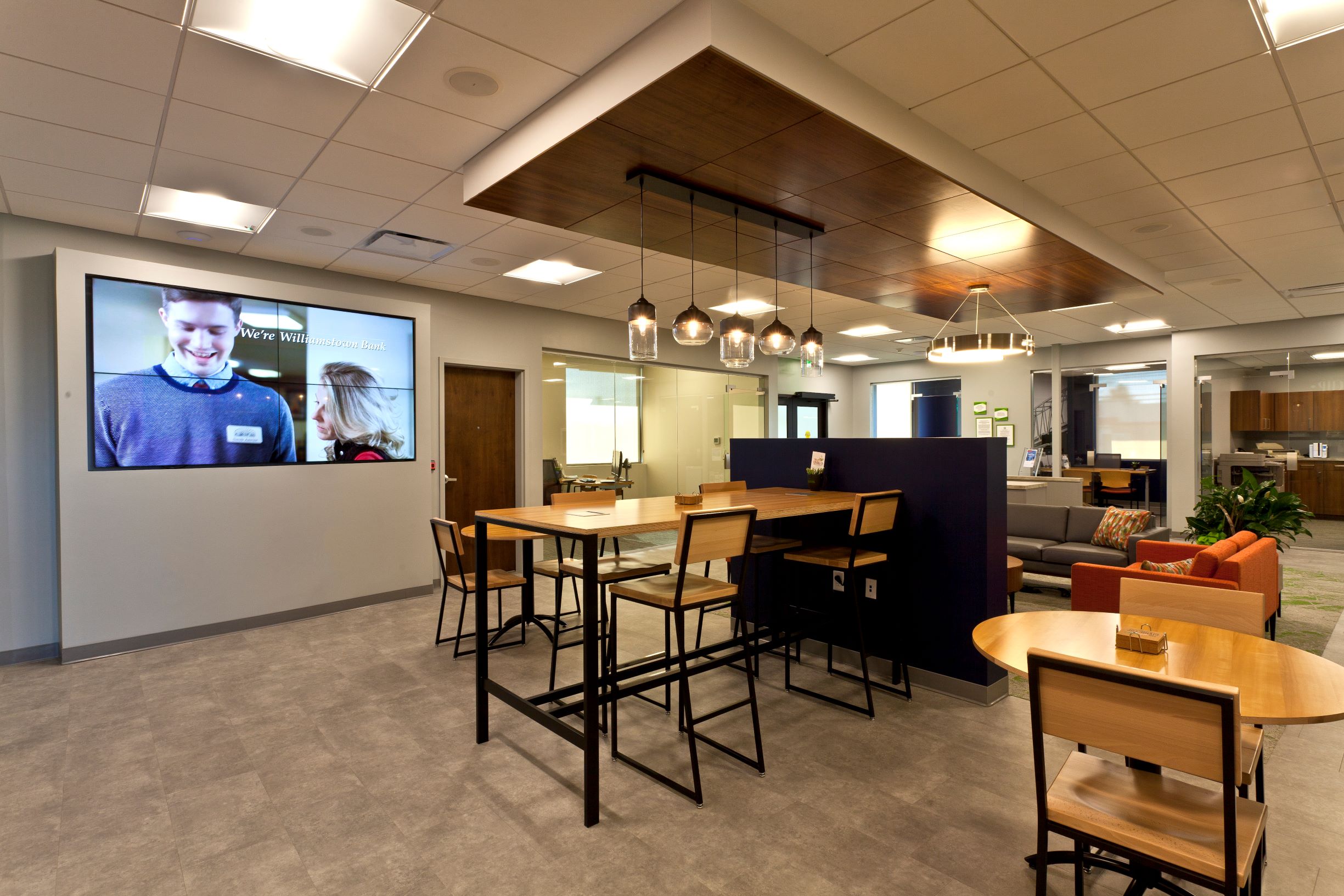 Conference room technology was installed to further elevate collaboration in the branch. Partitions synced with display and audio technology allow users to quickly adapt the room for each meeting's unique needs at Williamstown Bank.